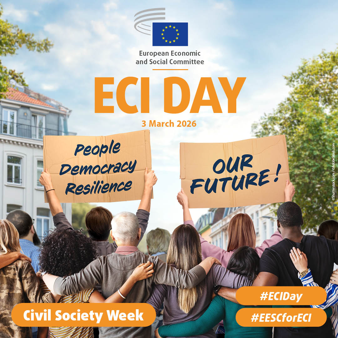 The European Economic and Social Committee is hosting the 14th annual European Citizens’ Initiative (ECI) Day in Brussels on Tuesday 3 March 2026, as part of Civil Society Week (2-5 March). For more information, check out the #ECIDay and #CivSocWeek webpages and follow us on social media. Seize the opportunity to make your voice heard and co-shape the future of citizen participation in the EU – registration opens at the beginning of February.