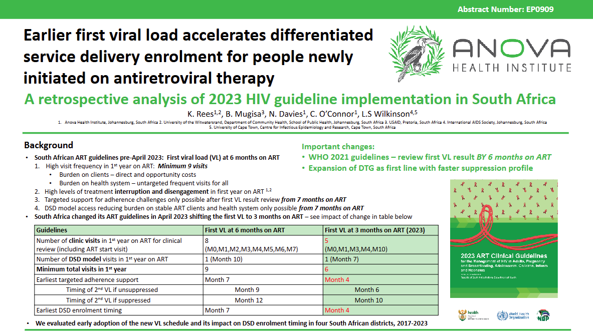 In most African countries, the first VL is taken six months after starting ART. Results are typically available at the clinical consult thereafter, delaying DSD enrolment and support for those who are unsuppressed, despite guidelines recommending earlier entry. Eswatini, Kenya and South Africa are implementing earlier viral load testing.