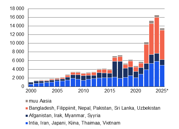 "Maahanmuutto Aasiasta Suomeen on vähentynyt viidenneksen ennätysvuodesta 2024. Edelleen Aasiasta tulijoita on kuitenkin ollut tammi-elokuussa 2025 kaksinkertainen määrä koronapandemiaa edeltävään aikaan verrattuna”, toteaa Rapo.