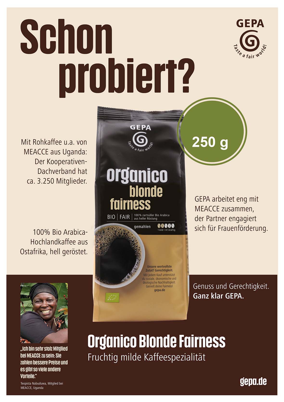 Seit Januar hat unsere Organico-Familie ein neues Mitglied: Den Organico Blonde Fairness, einen hellgerösteten Kaffee aus afrikanischen Arabica-Kaffees - unbedingt probieren! Im März gibt es die neue Kaffeesorte zur Einführung in der Aktion "Schon probiert?" mit einem Zusatzrabatt von 5% für Weltläden und Weltgruppen.