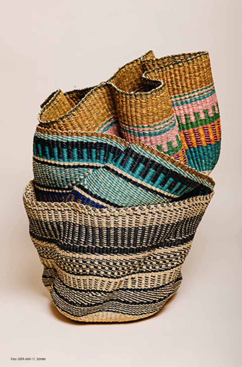 Auch bei diesem Korb wird mit dem Flechten am Boden begonnen. Während des Flechtens wird der Korb in die Wellenform gebracht. Für einen Bolgakorb Wave benötigen die Korbflechterinnen insgesamt ca. 3-4 Tage. Da der Material- und Zeitaufwand höher ist, liegt der Preis des Wave-Korbes auch über dem des Bolga-Einkaufskorbes. Dieser Korb ist Blickfang & Ordnungsstifter in einem.