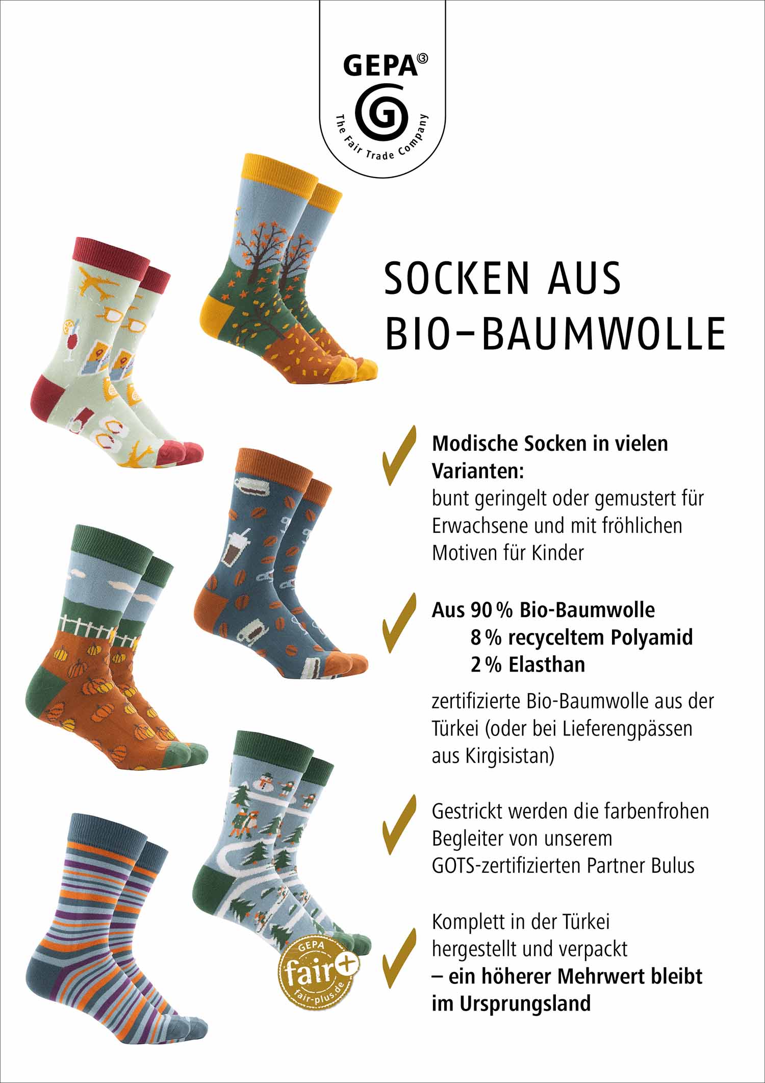 Nicht nur die Blätter werden bunt, auch die neuen Socken-Modelle gibt es in warmen Herbstfarben! Auf den Bio-Baumwoll-Socken aus der Türkei sind z.B. Bäume, Kürbisse und Winterlandschaften zu finden.